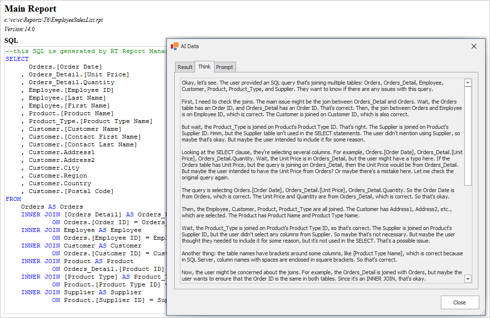 - Added AI features to explain report meta data, sql statemnts and formulas in Documentation and Search / Version control.