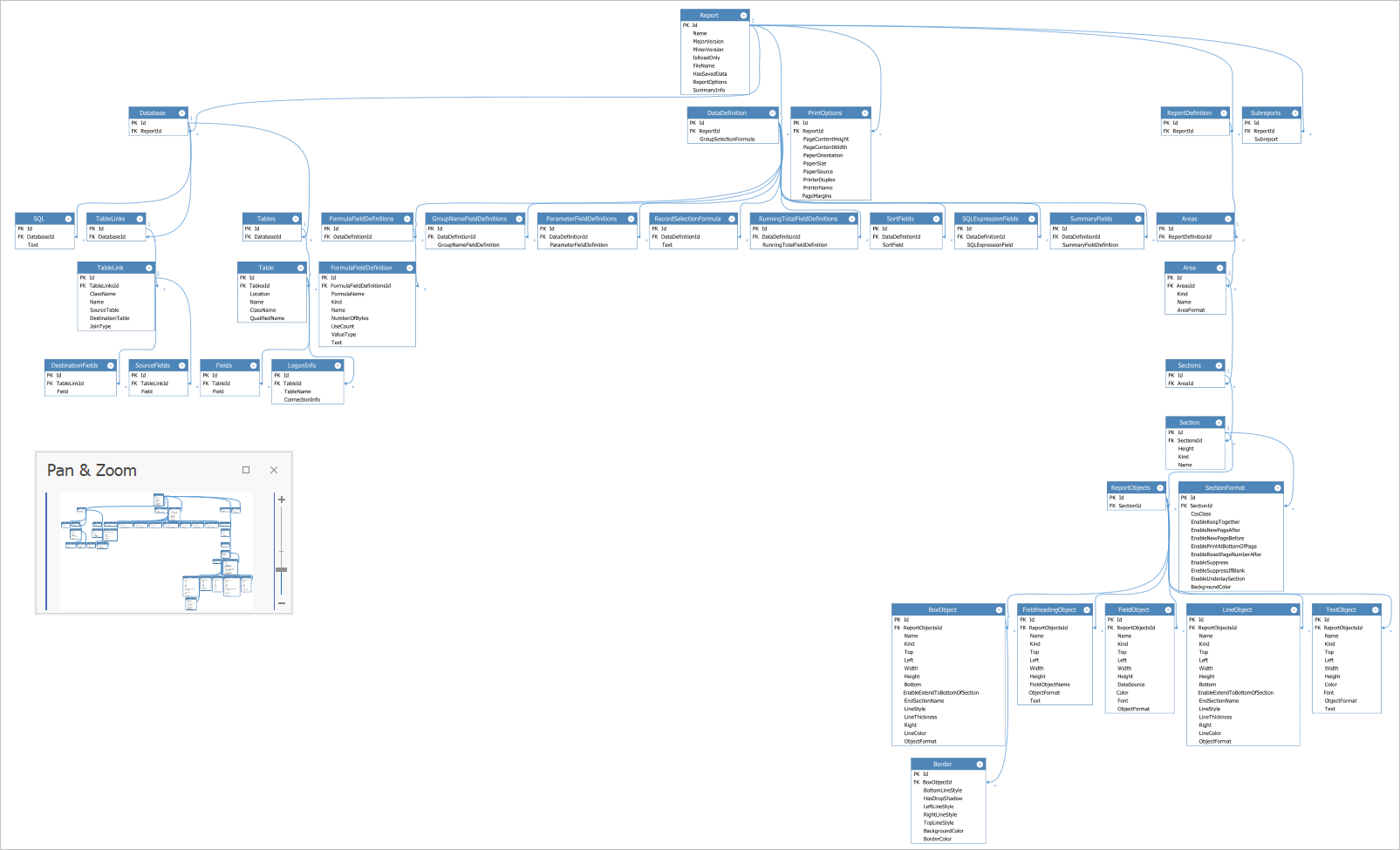Here is schema presentation of a sample Crystal report document