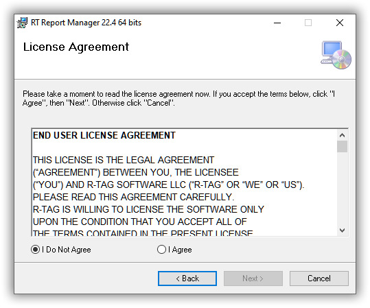 The setup will show EULA screen for RT Report manager. Please read the license agreement carefully and if you do not accept it do not continue with the installation.