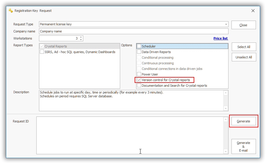 Select desired license type, fill the Company name and click the button “Generate”. Copy the generated key from the field “RequestID” and send it to support@r-tag.com. You can use also use button “Generate & E-mail”.