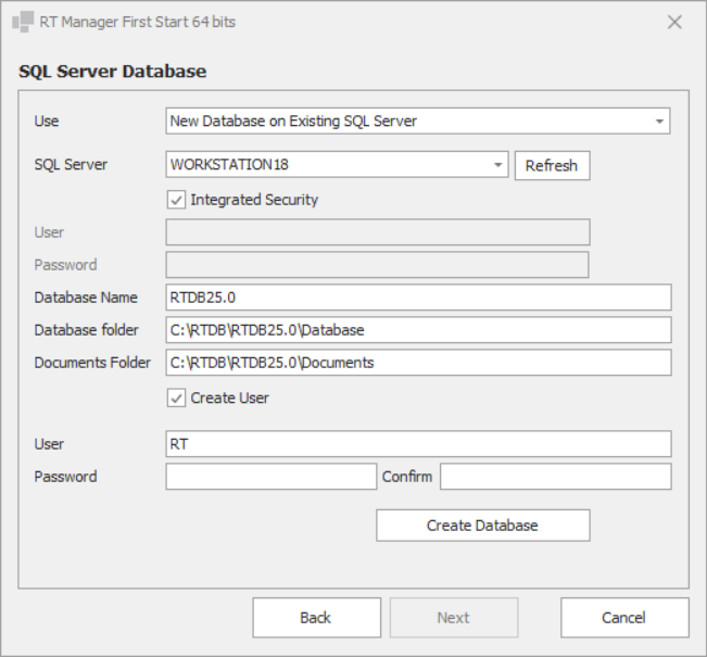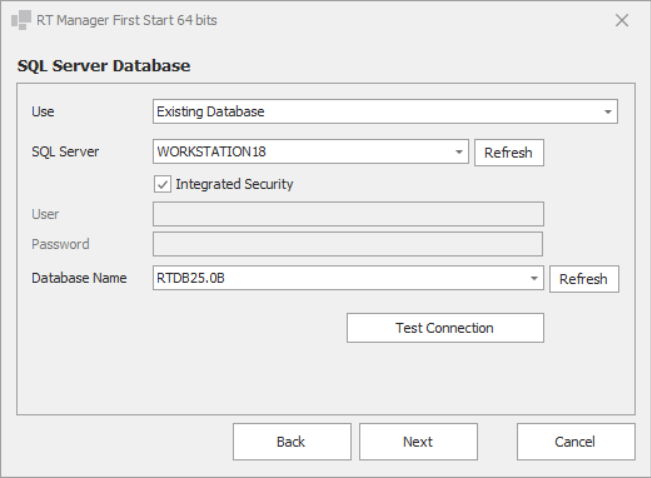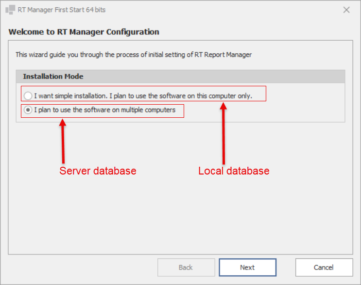 RTRM supports 2 database types: Local and Server. Both are based on SQL Server, however there is a difference in the supported application features.
